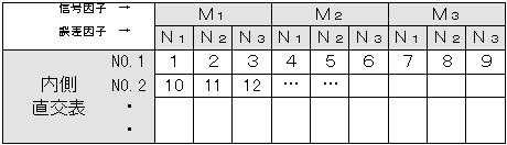 - 外側は信号因子3水準、誤差因子3水準の2元配置となっています。この場合、各実験ナンバーのデータ数は9になります。