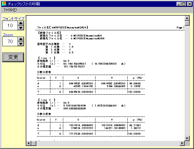 - ファイルの変換情報と各実験ナンバーの分散分析表や校正に必要な情報(動特性のSN比に変換を行った場合)が表示されます。
