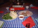 「火鍋子」?まあようするに、海鮮鍋ですな。タレが独特で、ニョクマム(魚醤)みたいな感じなんだけど、あれ程生臭くないし、それに辛味調味料を足すんだけれど、知らないもんでかなり多めに入れたら、口の中が火事!でも味は美味でありました。