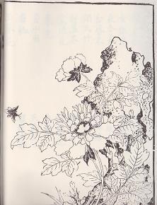 もとより牡丹図は桃山金碧隙壁画以来、恰好の画題でした。大覚寺宸殿襖絵として残る山楽筆の岩と牡丹図、または智積院の等伯襖絵の一部にも、豪放華麗な岩と牡丹の図が見出されます。しかし、古九谷色絵の場合、慶長好みの金碧牡丹図に啓発されるところはあったにせよ、加賀大聖寺藩の然るべき目付役が、藩窯の陶工に差し示した絵手本としては、これを上述の金碧隙壁画とするよりは、むしろ八種画譜とするに如かずと考えたのでしょう。敢えて言えば、「草木花詩譜」(八種画譜)の巻頭を飾る牡丹図が即ちこれです。この木版画牡丹図の点景としては蜂が描かれていますが、例えば同じ画冊の番椒図にみえる挙羽蝶を、前図の蜂に替えさえすれば、色絵古九谷の牡丹図の趣向は、殆どそのまま成立すると言えます。挙羽蝶がしばしば画冊に出てくるのはすでに述べましたが、「草木花詩譜」では、全四十五図のうち、五図までが挙羽蝶で占められています。