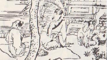 明月の夜に遠来の友人を迎えて、松韻を楽しみ、酒をくみかわす主人の喜びを、一気に詠いあげた詩です。図絵の主客二人のたたずまいと、小孩(こども)が風炉で酒をあたためる姿は「八種画譜」も色絵古九谷も、図様は全く同じです。画譜では詩意に従って、軒端近くの松樹のもとに筵を敷いて、月の出を待つ間もあらず、折から山の端にかかった明月を振向いて、主客ともに感に耐えぬ風情がうかがわれます。色絵にあっては、老松を配するばかりで、月明の夜、杜鵑(ホトトギス)が空の一角を横切る瞬時の一声をとらえて、さらに詩情をこまやかにするところがあります。